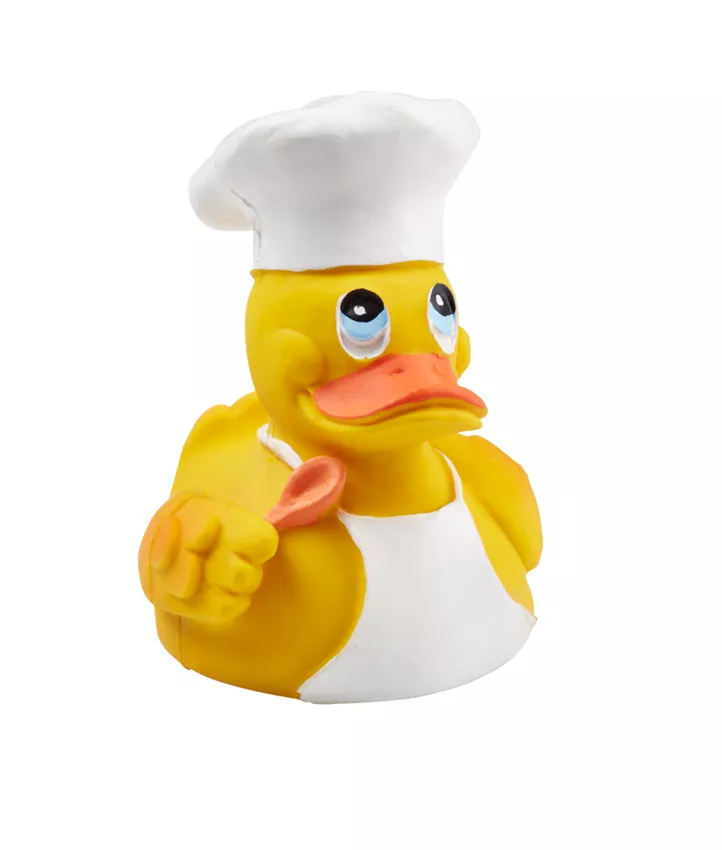 The yellow rubber duck "Chef" is an adorable little duck dressed up as a chef. It wears typical chef's attire, including a chef's hat and apron.