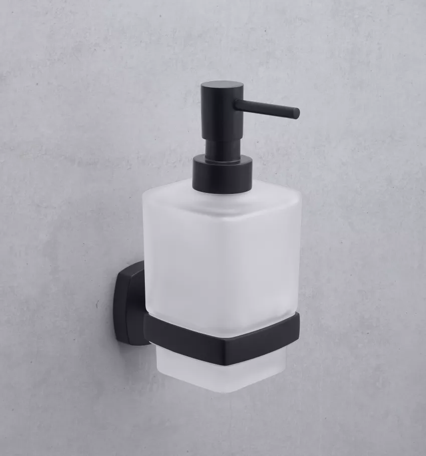The Quinto matte black glass soap dispenser is an attractive accessory that adds a touch of sophistication to your bathroom. With its sleek design and matte finish, it seamlessly integrates into modern and elegant bathroom settings.