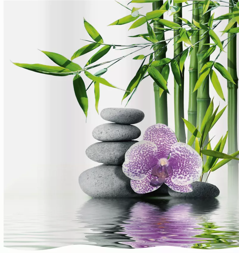 Bring a relaxing touch of a wellness oasis to your bathroom with the Spa shower curtain, adding a stylish accent with its beautiful motif featuring flowers, bamboo, stones, and water.